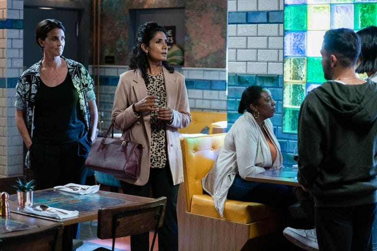 Eve and Stacey run into Suki and Ravi while Eve is out on a date, and Stacey makes it clear that Suki should avoid Eve.